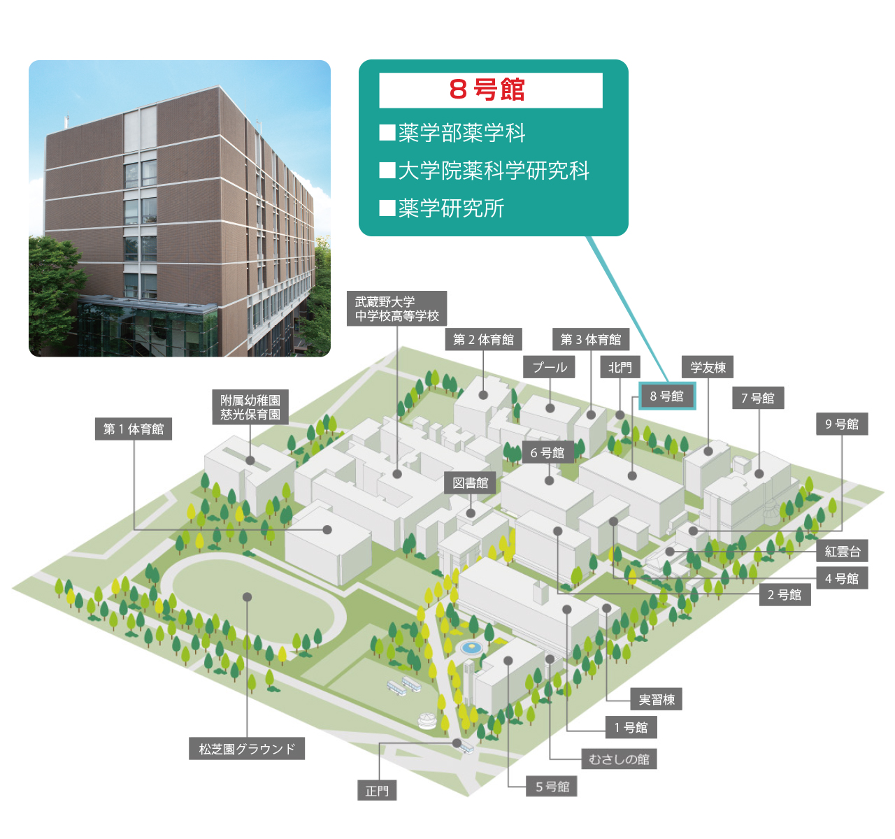 薬学部が設置されている武蔵野キャンパスは、附属薬用植物園も常設されている緑が多い、落ち着いたキャンパスです。 ※地図をクリック(タップ)で拡大します。